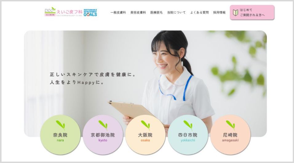 当院「えいご皮フ科」は、奈良院、京都御池院、大阪院、四日市院、尼崎院と5つの院があります。