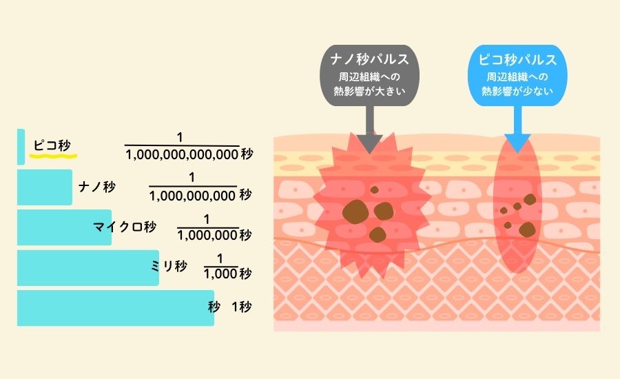 従来のレーザーは「ナノ秒」単位で光を照射しますが、ピコレーザーは「ピコ秒(1兆分の1秒)」単位のごく短い時間で照射されます。