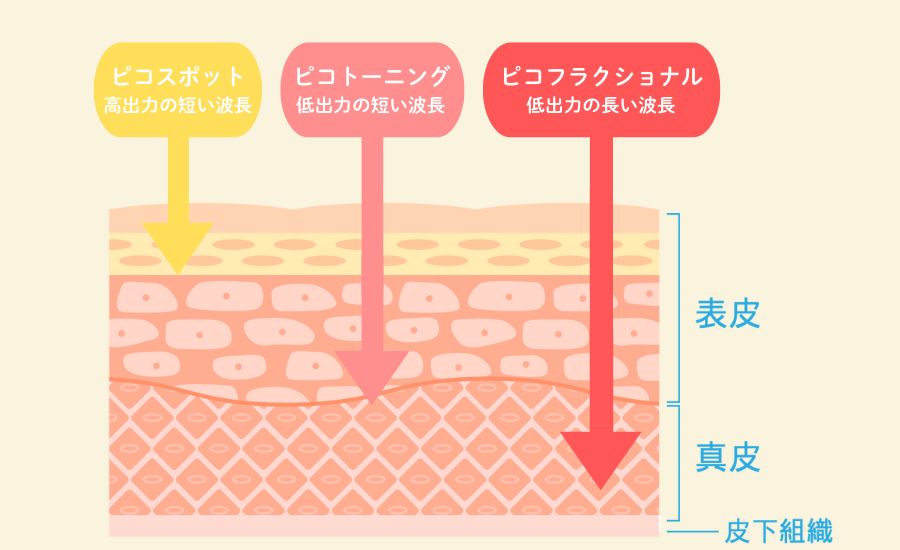 「ピコスポット」「ピコトーニング」「ピコフラクショナル」という3つの照射モードは、それぞれ、照射の深さや出力、目的が異なるため、肌の状態や悩みに合わせて選ぶことが大切です。