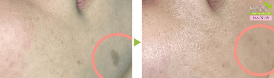 色の濃い境界明瞭なシミ(老人性色素斑)やそばかすの場合、1回の施術でも変化を実感される方は少なくありません。