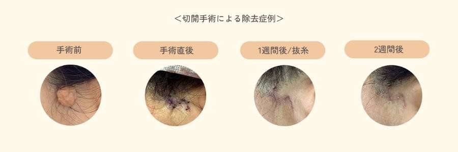 皮膚の中に隠れた部分まで丁寧に除去するため、一時的に凹みが生じますが、1〜2週間ほどで再生し、凹みは目立たなくなります。
